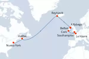 Itinerario : Nueva York, Halifax, Reykjavik, Killybegs, Belfast, Cork, Le Havre, Southampton