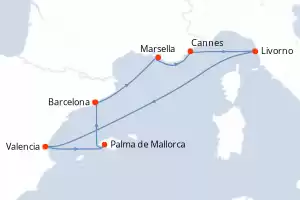 Itinerario : Barcelona, Marsella, Cannes, Livorno, Valencia, Palma de Mallorca, Barcelona