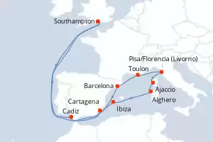 Itinerario : Southampton, Cadiz, Barcelona, Toulon, Pisa/Florencia (Livorno), Ajaccio, Alghero, Ibiza, Cartagena, Southampton