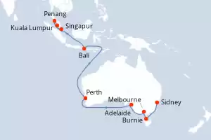 Itinerario : Sidney, Burnie, Melbourne, Adelaide, Perth, Bali, Kuala Lumpur, Penang, Singapur