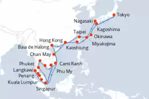 Itinerario : Tokyo, Kagoshima, Okinawa, Kaoshiung, Hong Kong, Chan May, Phu My, Singapur, Kuala Lumpur, Penang, Langkawi, Phuket, Phu My, Sihanoukville, Laem Chabang, Ko Samui, Singapur, Cami Ranh, Baia de Halong, Hong Kong, Taipei, Miyakojima, Nagasaki, Tokyo