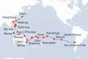 Itinerario : Tokyo, Keelung, Hong Kong, Subic bay, Boracay, Puerto Princesa, Benoa, Darwin, Cairns, Brisbane, Sidney, Nouméa, Lifou, Suva, Nukualofa, Rarotonga, Papeete, Pitcairn, Isla de Pascua, San antonio Chile