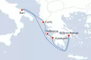 Itinerario : Bari, Santoríni, El Pireo Atenas, Katakolon, Kefalonia, Corfú, Bari
