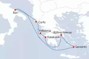 Itinerario : El Pireo Atenas, Katakolon, Kefalonia, Corfú, Bari, Santoríni, El Pireo Atenas