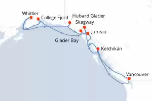 Itinerario : Vancouver, Ketchikán, Juneau, Skagway, Glacier Bay, College Fjord, Whittier, Hubard Glacier, Glacier Bay, Skagway, Juneau, Ketchikán, Vancouver