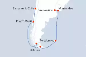 Itinerario : Buenos Aires, Montevideo, Punta del Este, Puerto Madryn, Puerto Argentino, Ushuaia, Punta Arenas, Puerto Chacabuco, Puerto Montt, San antonio Chile