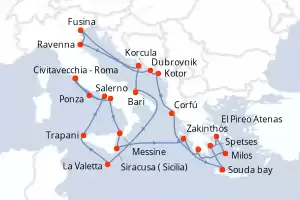 Itinerario : Civitavecchia - Roma, Ponza, Salerno, Messine, Siracusa ( Sicilia), Zakinthos, Souda bay, Spetses, El Pireo Atenas, Milos, Kalamáta, Corfú, Kotor, Dubrovnik, Fusina, Ravenna, Korcula, Bari, La Valetta, Trapani, Nápoles, Civitavecchia - Roma