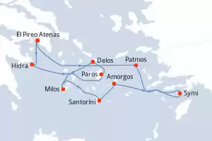 Itinerario : El Pireo Atenas, Patmos, Symi, Amorgos, Santoríni, Milos, Delos, Paros, Hidra, El Pireo Atenas
