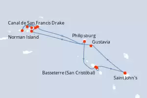 Itinerario : Saint John's, Gustavia, Norman Island, Canal de San Francis Drake, Jost Van Dyke, Sopers Hole, Islas Virgenes, Spanish Town, Philipsburg, Basseterre (St Kitts), South Friar's beach, Saint John's