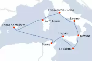 Itinerario : Civitavecchia - Roma, Porto Torres, Palma de Mallorca, Tunez, Trapani, La Valetta, Messine, Salerno, Civitavecchia - Roma
